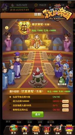征伐九州,不可失大义,而成为朝廷命官自然就拥有了先天的优势。游戏中,共设有9大品级官职,主公通过游戏的日常PVE活动,达到不同条件,即可获得官职并晋升,同时,官职还会给主公提供大量攻击和生命属性,每日还能领取俸禄。日积月累,资源不可小窥。
