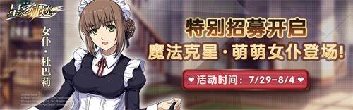 7月29日~8月4日,《星之轨迹》将开启特别招募活动,疾如雷电神速出手,魔法克星萌萌女仆!SSR女仆·杜巴莉获得概率提升,还有以下特殊福利哦~