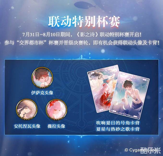 7月31日-8月10日,游戏内将开启联动限定杯赛“交界都市杯”,参加并晋级决赛轮即有机会获得伊萨克、安托涅瓦、薇拉头像以及“吹响夏日的号角”、“夏星与热砂之歌”卡背等联动限定奖励!