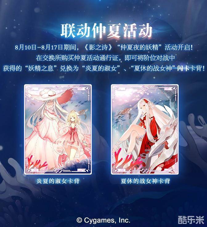 8月10日-8月17日,游戏内将开启联动限定仲夏活动,玩家只需购买仲夏通行证,即可在阶位对战中获得“妖精之息”,使用“妖精之息”可以兑换“炎夏的淑女”以及“夏休的战女神”限定闪卡卡背!
