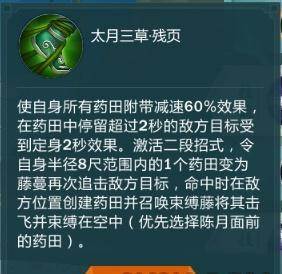 这本秘籍还有一个特别重要的地方在于他只重置一个药田,并且只重置面前最近的一块药田,如果没有试过的小伙伴你可以试试1222的秘籍点法,重置月缚藤制造的药田,有奇效哦,可以试试,我就不剧透啦,然后这本秘籍的药田附带60%减速,情不至深的伤害增加是计入的哦,大概这本秘籍要讲的就是这些。