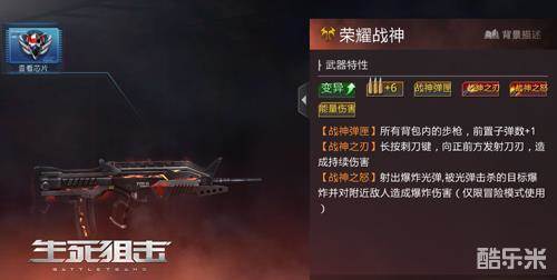 玩家当天在每日任务中领取两块荣耀战神碎片后,可在生化禁区通过样本继续兑换碎片,当天兑换上限为五块。若玩家手中的生化样本足够,仅需15天即可合成英雄级武器荣耀战神。该武器在玩家死亡时不会掉落,且拥有专属击杀图标,在冒险模式中可使用技能“战神之怒”射出爆炸光弹,被击杀的目标爆炸会对附近敌人产生爆炸伤害。