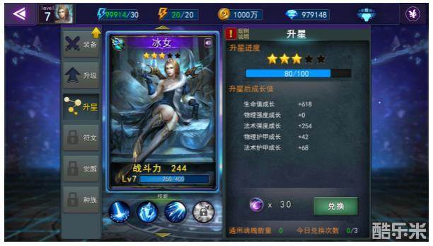 英雄的成长由装备、升级、升星、符文、觉醒、种族组成,以冰女为例: