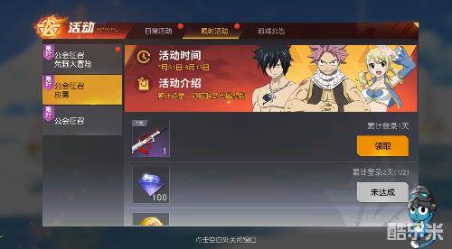 丰厚福利来袭!各位玩家每日登录,都能在限时活动——公会征召·应募界面中领取限定奖励,累计七日登录,还能领取妖精的尾巴专属T恤!登陆就能领好礼,各位小伙伴千万别错过!