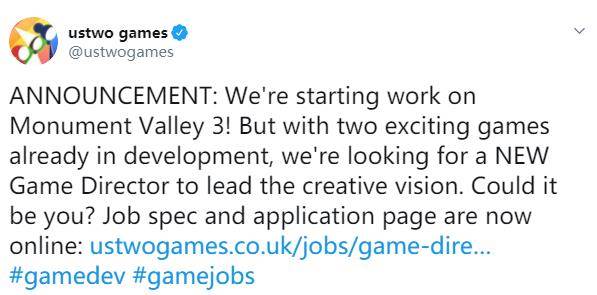 “声明:《纪念碑谷3》的开发工作开启了!但是由于我们有另外两款游戏已经在开发当中,所以我们正在寻找一名新的游戏制作人来领导视觉创意(creative vision)。”
