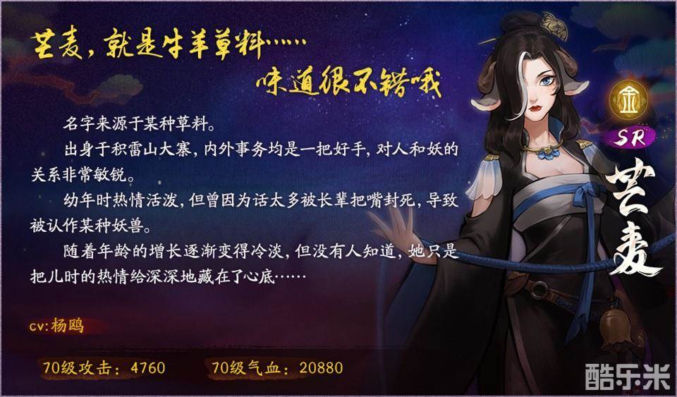 勤恳的芒麦出阵时,则会每秒扣除5%的最大气血,为前排妖灵带来攻击力和妖气获取加成,加成幅度最高可达30%,芒麦气血值低于30%时自动停止扣除。