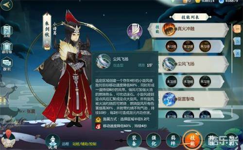 技能三尘风飞扬,推荐秘籍残页(小旋风生成之后击飞敌对目标1S),也可以根据配置选择秘籍断篇(调息时间降低3S,小旋风伤害提高20%)。