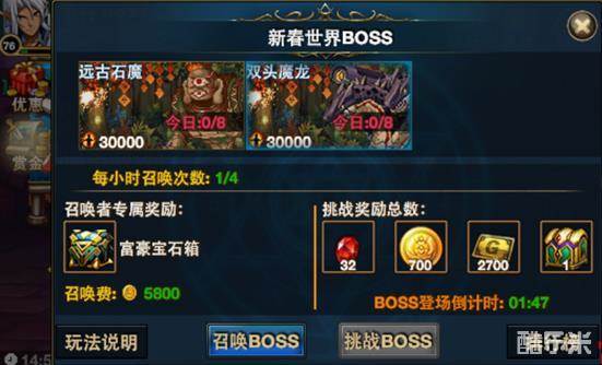 本次BOSS每小时召唤次数4数,跟随着土豪的脚步进入挑战BOSS吧,每次挑战都有BOSS登场倒计时,不过你可要眼急手快,手慢就是“挑战人数已达上限”进入之后狂会出现一只双头龙BOSS,和无数小怪,由于人数较多,可能出现卡屏,掉线等之类的情况,属正常情况,这在任何游戏里都经常出现,因为大家都在狂放技能嘛。
