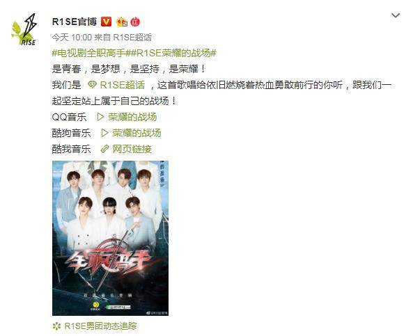 第二首是R1SE男团合唱的《荣耀的战场》,不知道大家对R1SE男团熟不熟悉?他们在腾讯视频的选秀节目中《创造营2019》脱颖而出成团出道,主要成员有周震南、何洛洛、焉栩嘉、夏之光等,都是非常优秀的男孩子。