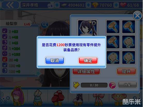 装备品质的提升也是需要花费钞票的。品级越高所需要的钞票越多,所以为了好好提升妹妹的装备,哥哥们平时一定要多赚钱哟~