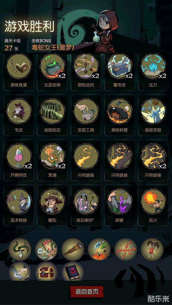 初始卡组:美味食谱、两个一级的法力牌、攻击牌、两个烹调、行动牌实验工具