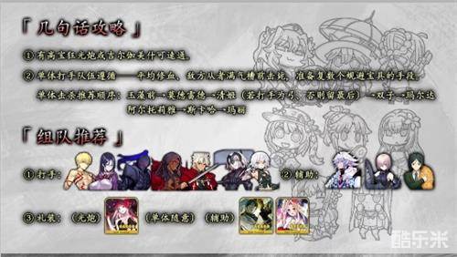 有条件的话,孔明梅林带黑杯强力光炮就能轻松过关。毕竟总体只有三面怪。这操作也不太需要Meteor说什么。如果你组不成这样的极致配置,比如缺个黑杯少个拐或没有强力光炮什么的,也可考虑折中一下,盾孔梅白贞取其二搭配一名泛用性打手推进。如果你缺的是光炮打手,黑狗以及杰克也是不错的选择。平均修血,优先击杀气槽将满的从者。稍微注意下玛尔达的自充,以及斯卡哈的宝具即死效果,