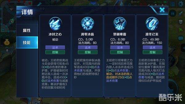 技能解析:冰封之心赋予了王昭君一个护盾,可以很好地帮助王昭君抵免伤害,护盾破裂更可以对敌方造成伤害与减速。无论是前期对线时还是后期团战时,护盾可以在王昭君释放三技能时很好地保护王昭君,抵免其所受伤害,破裂时更可以有效的补充伤害。