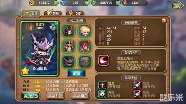 织田信长是一个力耐型英雄,也是玩家在初始游戏中就可以选取的5位英灵伙伴之一。力耐型英雄攻击力惊人,而且血量和魔量也很不错。只要有足够的命中就可以打出成吨的伤害。