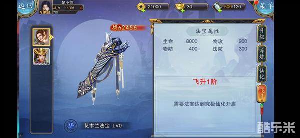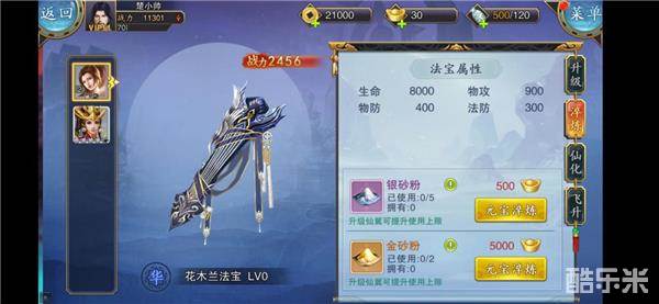 玩家到达45级后即可激活法宝系统,每个武姬激活法宝后会得到一个初始法宝,法宝可以使用消耗道具铁砂粉升级并且提升属性,等级上限为100级。还可以通过使用[银沙粉]和[金沙粉]等道具进行淬炼,来提升法宝的属性。值得注意的是[银沙粉]和[金沙粉]有使用上限,会根据法宝的等级提高而提高。 法宝还可以通过赋予道具进行仙化,仙化后的法宝不仅更加绚丽,同时还会增加法宝属性。法宝仙化分为初级、中级、高级、究极四段仙化阶级,随着仙化阶级提升的提升,法宝属性也会不断加强。法宝还具有飞升功能,不过飞升的前提需要法宝仙化满阶。