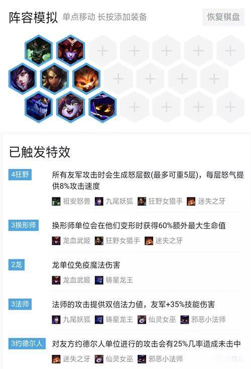 这样的阵容在前期我们很容易吃到连胜,直接存金币吃利息。在5人口的时候龙女也有可能出现,但是在6人口后,3费卡龙女牌的几率达到最高的31%,我们便可以开始找英雄了。接下来,就是继续升级人口搜龙女、龙王,选秀则拿反甲、狂徒、绿叉的基础装备。等到龙女来装备直接给龙女,阵容初级成型。