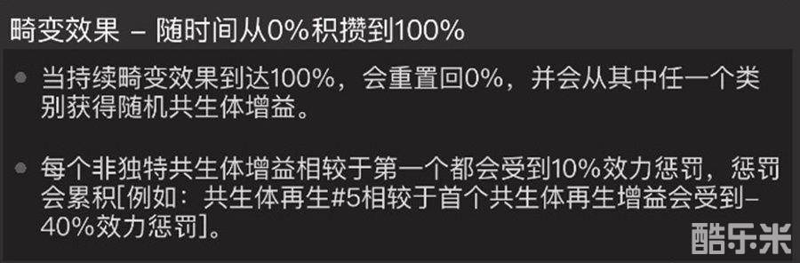每局开局,毒鸭的血条下方会有一个黑色的小圈,里面有个白色的蜘蛛,这就是畸变效果累积了,开局为0,以5个为单位自动增长,每增长到100,就会随机产生一个共生体增益,增益一共六种,具体如下: