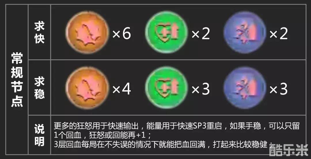 如此来说,如果需要狂怒回血多一些,那么第一局可以叠2层狂怒+1层回血,这样第二局开局翻倍;如果需要狂怒和回能多一些,则第一局可以叠2层狂怒+1层回能,第二局翻倍,其余需要的,靠后面再累积即可。