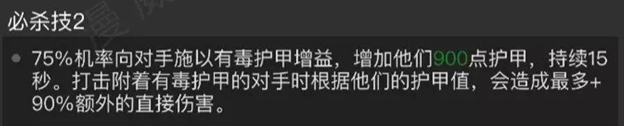 可以看到,SP2会给对方上个持续15秒的有毒护甲,在攻击有毒护甲的对手时,会产生额外90%的伤害,输出几乎翻倍。那么为什么前面没觉醒时没有提到SP2呢?是因为有毒护甲只持续15秒过短,除非有3层以上回能,否则第一个护甲结束前无法启动第二个造成SP2双倍爆炸式伤害,即使是为了给对手挂上有毒护甲,然后用普攻输出双倍伤害,这也大大延长SP3重启增益的时间,还不如快速SP3让增益无缝连接,用累积的多层狂怒输出来的快。