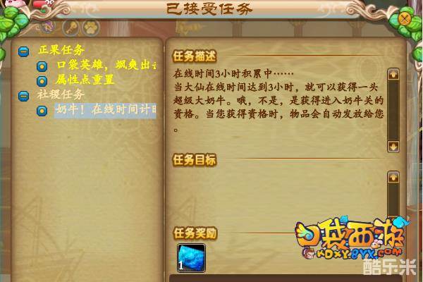 各位仙友可以在长安城昭阳殿魏征处领取计时任务,在线时长达到三个小时即可领取到“奶牛关秘密地图”。