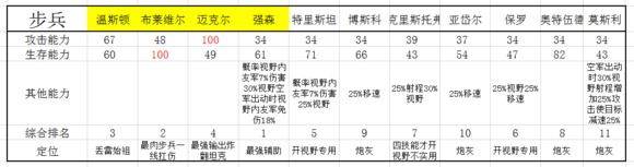 1.排名有LZ的主观性考虑,欢迎争论。LZ认为步兵辅助性最重要,然后是生存能力,最后才是丢雷和输出。精英比普通的等级高,血量高,晋升高,更值得培养。