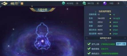境界系统贯穿游戏全过程,关联养成系统多个玩法,境界提升需要玩家角色达到指定的等级、战力、气海上限、副本通关、进阶道具等进阶条件。玩家橘色达成进阶条件,提升境界后,可以提升各个养成玩法的上限。此外,境界系统还配置四象技能,能极大幅度的提高玩家角色的输出和生存能力,并且可使用四象之魄提升四象技能的效果。