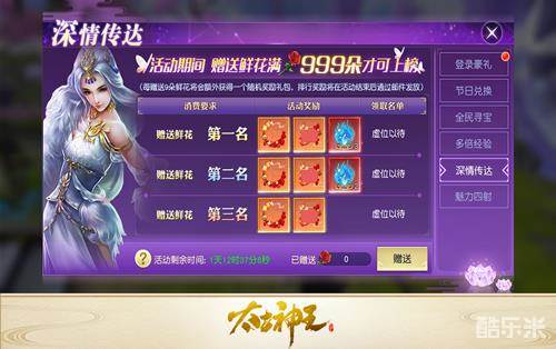 浪漫的七夕节最适合的活动还是告白与约会,这时候没有鲜花怎么行?《太古神王》为各位玩家准备了大量鲜花,准备向TA表达心意的玩家千万不要错过!活动期间每赠送9朵鲜花还可以获得一份随机奖励礼包,累计赠送或收到999朵鲜花的玩家会进入相应排行榜,