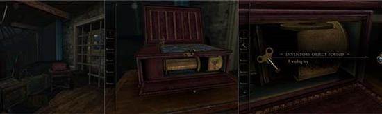 下楼右侧有个红色箱子,过去打开,原来是个音乐盒,拿起转轴钥匙,收好。