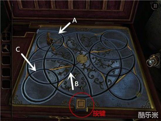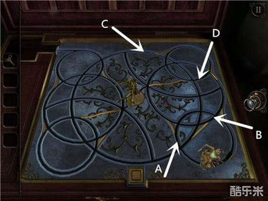音乐盒响起,面盘上的舞者转动。音乐盒下方有个方块按键,按下一次,面板上的金色阻路便会消失。模型小人就会通过,这里说下步骤,小人转至A处,按一下按键,小人至B处,按一下按键。待小人至C处,再按下按键使其通过。
