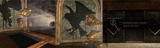 来到这里用钥匙将其打开,拉下手柄。旁边的笼子落下,一只乌鸦飞到上面房间。