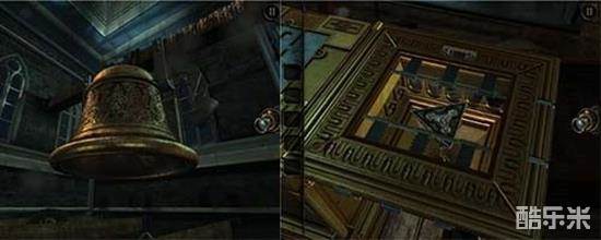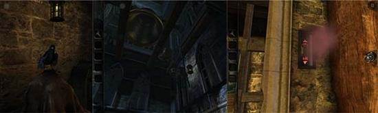 看到这里(如图所示),将转轮安上转动转轮,上方的钟敲响,铁门旁的红水晶被震碎,铁门打开。
