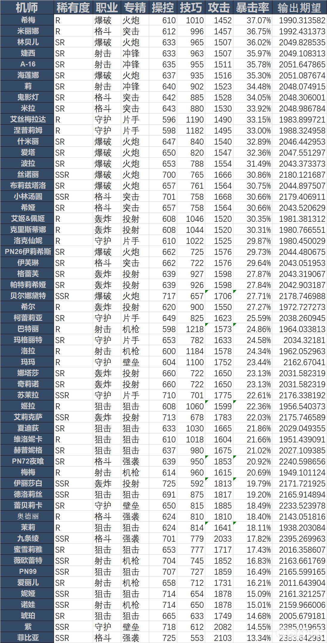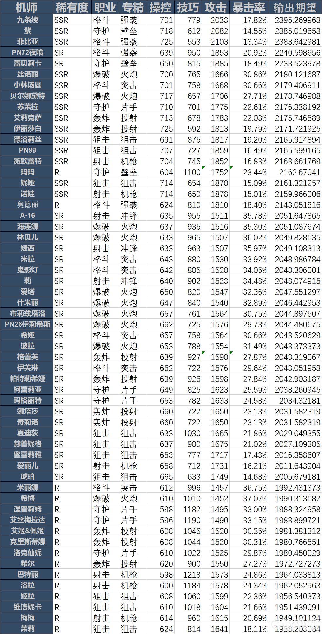 此表基于以下前提:60级,SSR四星,SR五星,R六星,不考虑机师被动技能,输出期望是平A的期望,仅用于参考。