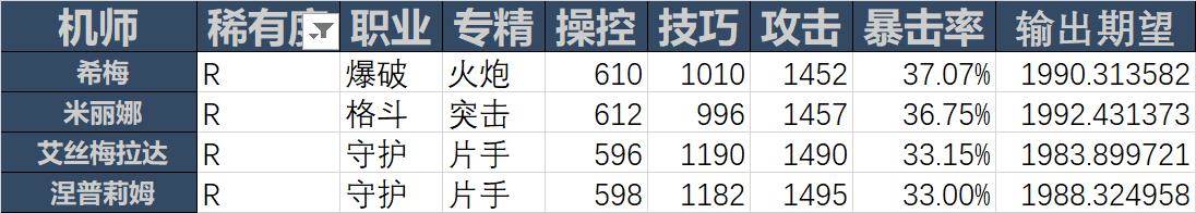 全六星的情况下,没有任何机师能够逆天改命突破自身稀有度的限制。然后还是那句话,攻击力易堆,暴击率难提,自带高技巧角色,在后期伤害的成长上还是优于高操作的机师的。