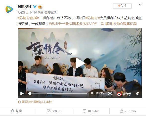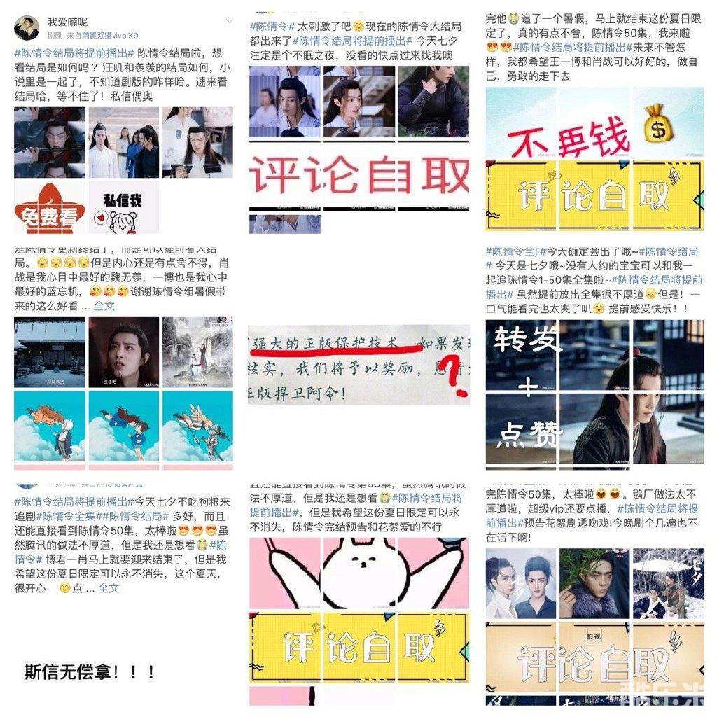 但是昨天晚上还没到八点的时候,腾讯按照不守时的惯例上传全部剧集,普通会员点开50集,发现竟然能看大结局!《陈情令》的大结局就这样被泄露了!在从八点开始的前15分钟左右内,有些普通vip已经看了最后一集,并把剧情剧透出来。顿时,盗版资源和剧透内容满天飞。