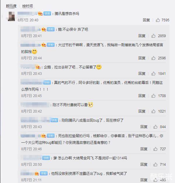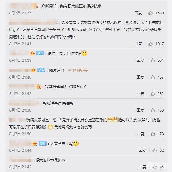 网友一众表示,“今年看过最大的笑话——腾讯:我们有强大的正版保护技术”。腾讯视频的这个做法是用剧组和演员的劳动成果圈钱,结果没圈到位,搞砸了,但仍然装瞎,毕竟还能通过超级会员继续赚钱。剧组和演员的劳动成果被这样糟蹋,大结局热度被提前透支,但腾讯完全不管,陈情令官方也无可奈何。