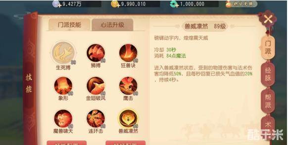 在技能的选择上大家可以根据自身需要来进行合理搭配。如果想多吸收一些伤害,那就带兽威凛然的门派技能。这个技能可以让自己变得更肉,在游戏的时候敌人打不动你,但你却可以轻松将敌人打败,非常的无解
