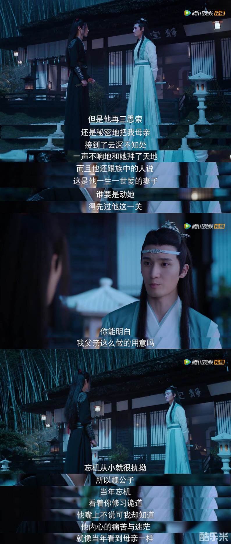 蓝曦臣还解释了蓝忘机为什么对“把魏无羡带回云深不知处”如此执着。因为蓝氏双壁的父母亲也是一对苦命鸳鸯——母亲杀死父亲的恩师,父亲为了母亲免受仙门百家责难,将她回云深不知处藏了起来,秘密拜堂成亲,又自己闭关从此不再见母亲,直到去世。所以在蓝忘机从小到大的观念里,总是执着地认为:只要把一个人带回云深不知处,藏起来,就可以保护他。