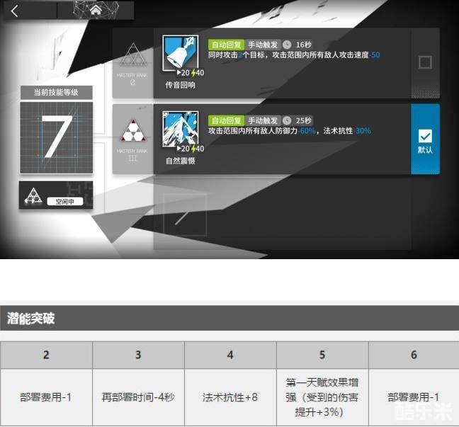 一技能,精二后同时攻击两个敌人变为天赋,专三后所有敌人攻速减60,可以有效缓解前排的压力,如果过关过程中经常发生堆怪的的情况,可以考虑带一技能。