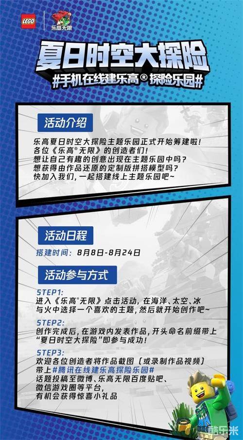 游戏开测的同时,《乐高:无限》开展了名为“夏日时空大探险”的主题乐园线上搭建征集活动,参与搭建活动的玩家将有机会获得由搭建作品还原的限定版乐高实物模型!