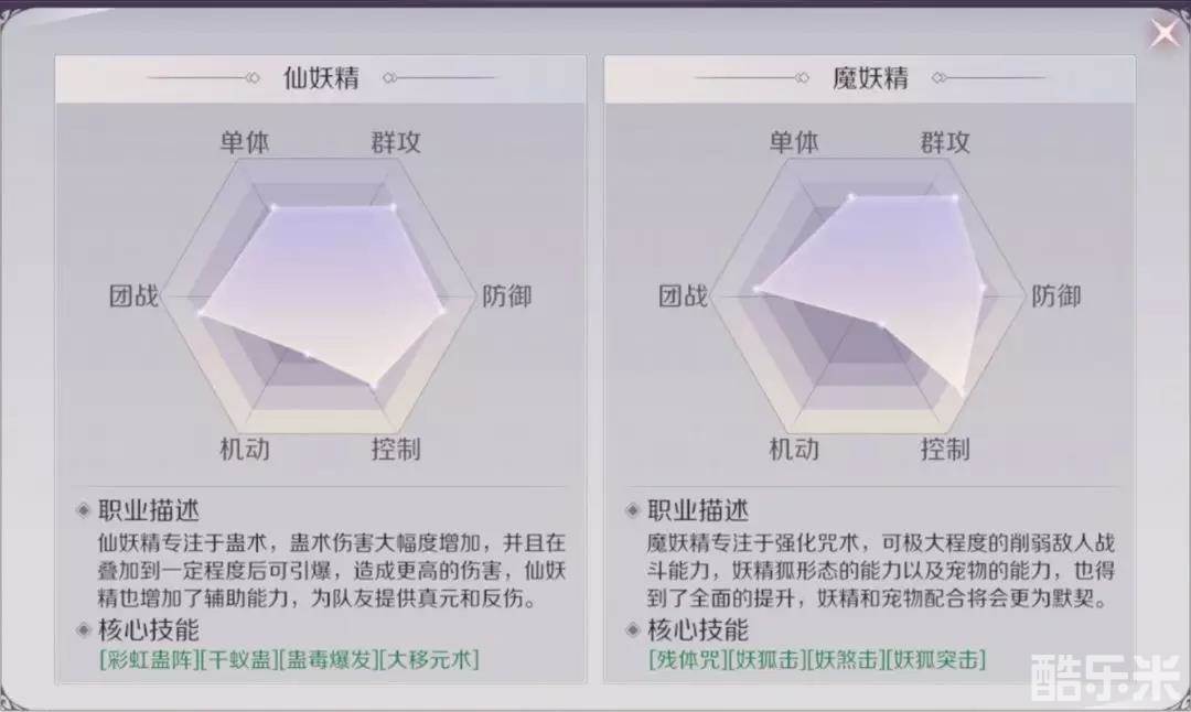妖精:团队buff技能可加反伤效果,也可为队友提供元气。有宠物协助作战,不同宠物效果不同(嘟嘟熊控制效果很强,飞天猪的射程远且单体伤害高,大力神有群控效果和群体无视防御的伤害效果)。技能还可驱散敌方目标身上的增益buff,拥有多种减益效果,降低敌方目标双防,使目标受到伤害增加。