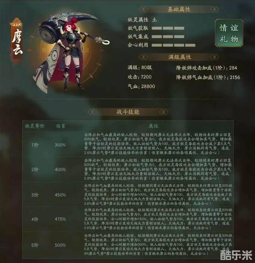 天地大力:摩云消耗所有气势,造成2.6%摩云气势*摩云技能倍率的伤害(伤害继承摩云的各项属性,无法会心)。妖灵达到二至四阶时,造成2.8%摩云气势*摩云技能倍率的伤害。