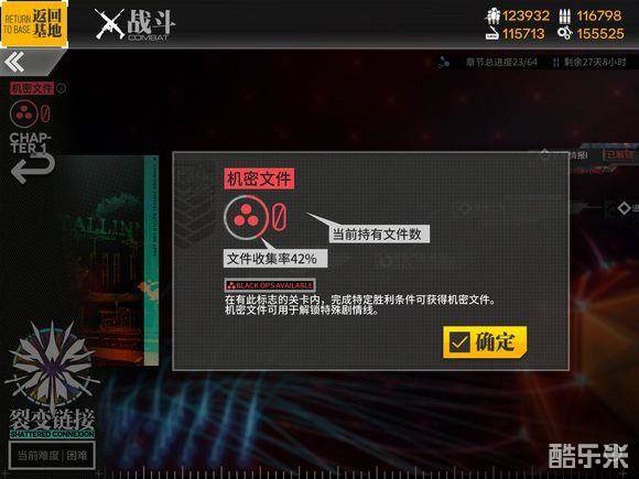 每个战斗关卡都给出了两个周目的任务目标,每完成一个周目的目标会得到一定数量的机密文件,不同难度的任务目标的也不同。