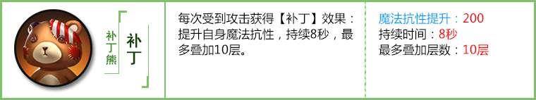 补丁熊适合走魔抗反击流的拜森,既增加魔抗也增加伤害。每次升级技能可以提升95魔法抗性,虽然数值看着不是很多,但可以叠加10层,而且没有CD,持续时间也比较长。培养难度也低,不喜欢氪金的玩家可以选择这只宠物。