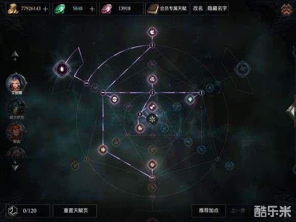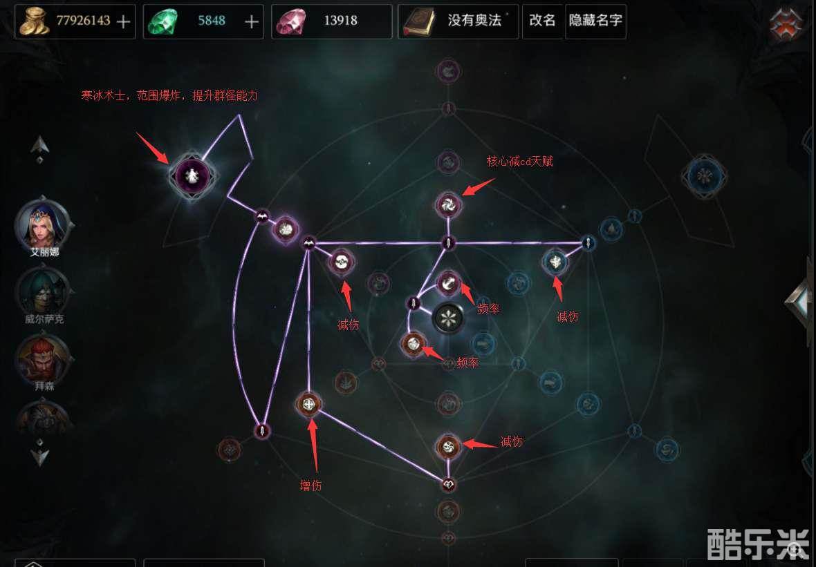 点出法师减cd核心天赋与左侧大天赋(寒冰术士),兼顾各种百分比减伤、频率增加,其他随意.