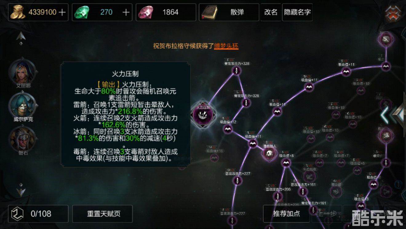 首先我也是小白,连暗黑都没玩过的,所以不可能是最强攻略(也是为了奖励嘛)曾经是按照网上一篇攻略以多重射击为核心的天赋玩的弓箭,奈何网卡(绝对不是手残.....),前期一个没动的复活羽毛竟然在一个上午就败完了。被逼无奈下走了推荐吸血流,奈何伤害感人。于是自己瞎琢磨了一套天赋,真的是自己琢磨的,网上有没有我也不知道,总之能为大家提供一点帮助就行了。废话到此为止,上图。
