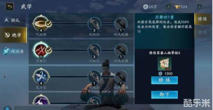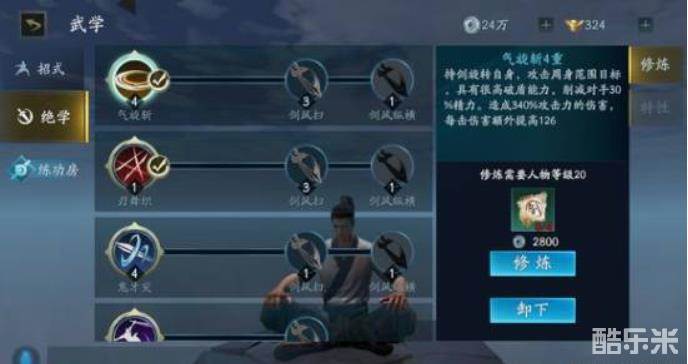 向前突进攻击,无视霸体,先手技能,接重攻击可以释放剑气。七重有两种效果,一种致盲,PK神技,优先升级。一种加一道剑气。装备狼牙可提高剑气伤害