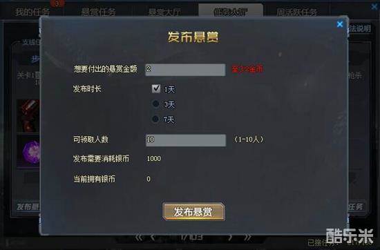 1)任务发布时,发布人可以设定悬赏赏金,赏金为金币。发布人成功发布悬赏任务后以后,扣除悬赏金币及上架手续费;