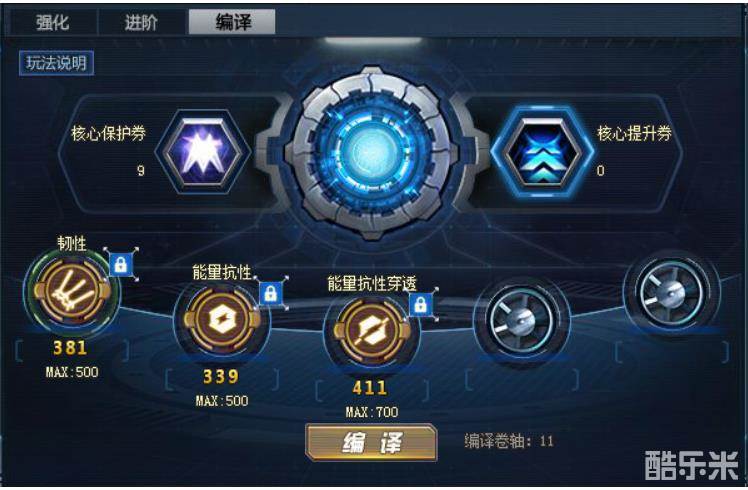 第三步:就是去升级这些属性。(记得一定要锁定)。升级的话点编译就可以升级了。在升级中我发现,不是每一次的编译都能使我变强,然后我就发现了“核心保护券”“核心提升券”。这两种券都是点击就可以使用(前提是你有)