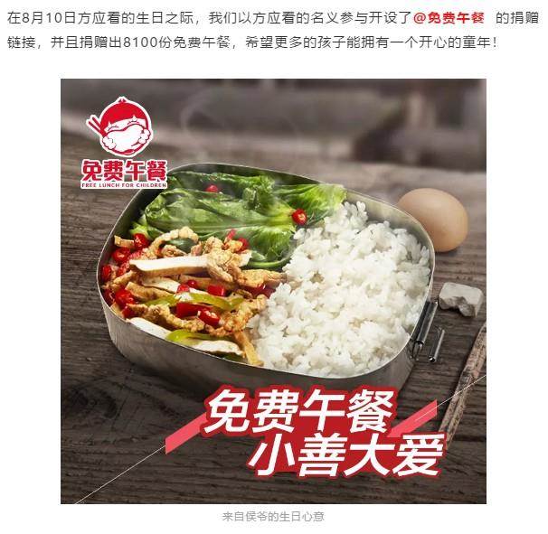 所以在他生日这天,《遇见逆水寒》项目组选择了一个特殊的方式来替他庆生。《遇见逆水寒》联合免费午餐,以方应看的名义捐出了8100份免费午餐,希望能借此把方应看的爱心传递出去,让更多的孩子们拥有开心的童年,也让方应看离自己的心愿更近一些。