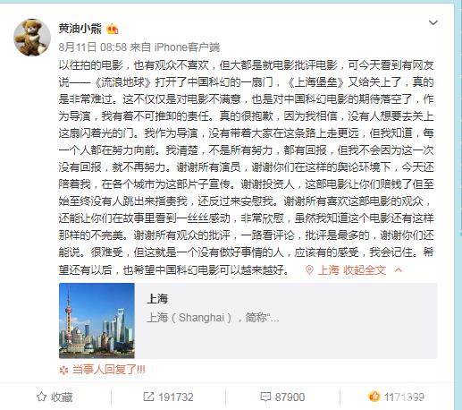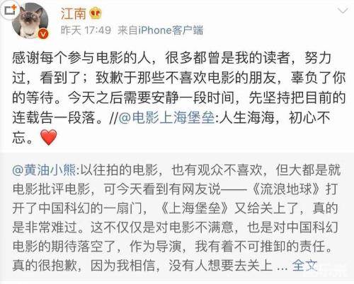 继导演滕华涛道歉称“不想关上中国科幻的门”后,电影《上海堡垒》原著作者、编剧也通过微博表示,致歉于那些不喜欢电影的朋友,“辜负了你的等待”。